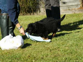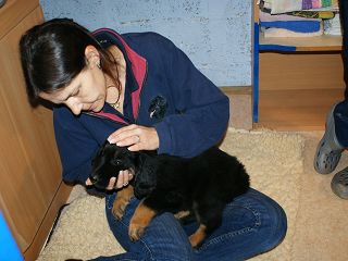 Zähne, Rute, Nabel, Abzeichen, Farbe usw. wird alles genau kontrolliert und protokolliert danach wird der Welpen-Wesenstest durchgeführt. |