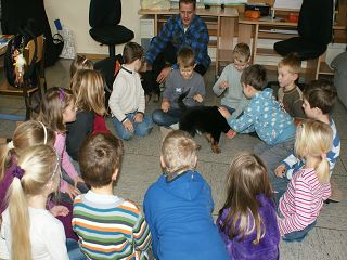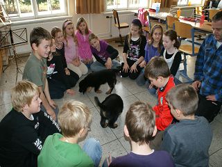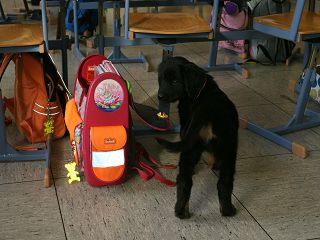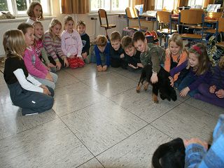 Wir waren schon öfters mit unseren erwachsenen Hunden in der Schule unserer Kinder zu Gast - diesmal besuchten zwei unserer Welpen die Kinder - wir (oder eher die Welpen) wurden begeistert begrüßt, gestreichelt und mit Leckerlis versorgt. Resümee: Schule ist cool!!! | |