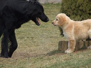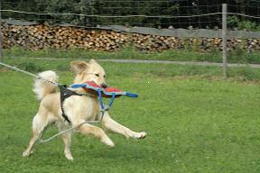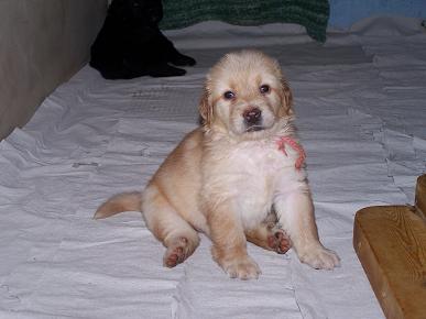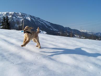 So wie Hermann einen Rüden von meiner Angel wollte, stand eigentlich von Anfang an fest, dass ich mir einmal von Hermanns Hündin Cho Cho eine Tochter behalte. Somit wurde dies auch bald in die Tat umgesetzt und ich behielt mir vom F-Wurf eine blonde Hündin. Wir tauften sie French Kiss - Rufname ist jedoch Kiss oder auch Rudolf (gemeint ist jener mit der roten Nase....). Kiss ist ihrer Mutter sehr ähnlich. Eigentlich wollte ich partout kein blond mehr, da viele blonde Deckrüden schon mal aussortiert werden müssen (wir können uns mit blond x blond Verpaarungen sowieso nicht anfreunden und es ist auch nicht gern gesehen im Klub). Und was oft ziemlich nervt: "Was - das ist keiiiinnnnn Golden Retriever? Der sieht aber genau so aus!" Nach bereits jahrelanger Erfahrung durch Angel (ist ja auch blond) mit dieser Aussage, regt es mich nun nicht mehr so auf. Meine Antwort ist meistens: "Tja, nur meiner vertreibt die Einbrecher....." Wie das Leben so spielt war bei diesem Wurf eine blonde (Kiss) und eine schwarze Hündin (Fly away) dabei. Die Entscheidung war nicht so leicht, schlussendlich waren wir jedoch überzeugt, dass Kiss besser zu uns passt. Sie ist eine spritzige, sehr aufmerksame und innerlich sicher mit einem Flummi (Gummiball) versehene Hündin. Äußerlich gleicht sie jedoch ihrem Papa sehr (Kopfform und Farbe sowieso). Momentan liebt sie es, kleine Stofftiere meiner Kinder durch die Gegend zu tragen oder zu werfen. Schwupps ist sie dann hintennach und das Spiel geht von vorne los. Beim Spielen mit mir ist es eigentlich egal, was ich in der Hand habe oder auch nicht in der Hand habe, irgendwo findet sie immer mal was zum Reinbeissen :)) Wir werden mal sehen, wie sie sich weiter entwickelt und hoffen, dass sie einmal in die Fußstapfen ihrer Mutter tritt! | |||||||||||||||||||||||||||||||||||||||||||||||||||||||||||||||||||||||||||||||||||||||||||||